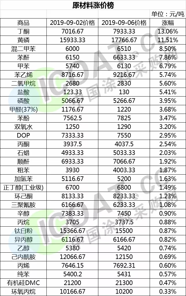 ????????在短短一周內,就有幾十種原材料價格呈現上漲趨勢,丁酮價格由7016.67元/噸漲至7933.33元/噸,漲幅為13.06%,位居漲價榜榜首。黃磷價格從15933.33元/噸漲至17766.67元/噸,漲幅為11.51%,混二甲苯價格由6000元/噸漲至6510元/噸,漲幅為8.50%,分別位居漲價榜第二名和第三名。