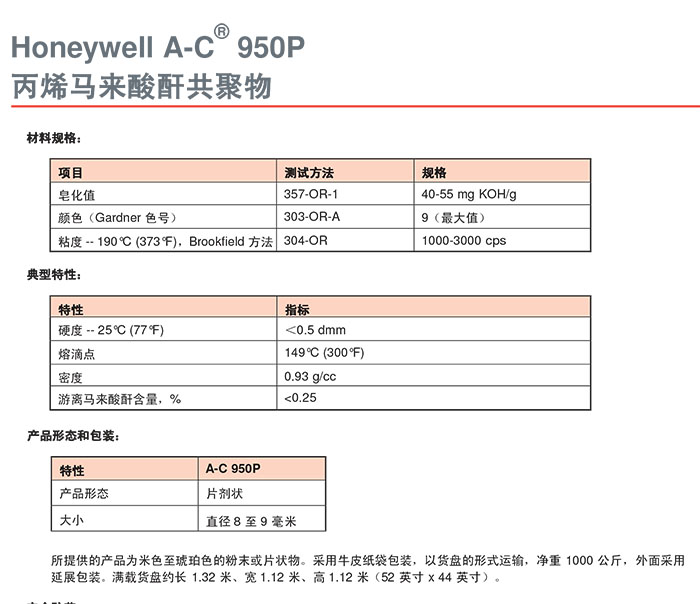 - 霍尼韋爾 honeywell 丙烯馬來酸酐共聚物 A-C 950P 適用熱熔膠電纜塑料改性 物性表, 霍尼韋爾 honeywell 丙烯馬來酸酐共聚物 A-C 950P 適用熱熔膠電纜塑料改性 產品參數,霍尼韋爾 honeywell 丙烯馬來酸酐共聚物 A-C 950P 適用熱熔膠電纜塑料改性 性能表,霍尼韋爾 honeywell 丙烯馬來酸酐共聚物 A-C 950P 適用熱熔膠電纜塑料改性 出廠報告, MSDS,, 物質安全資料表, UL黃卡,{ SGS報告, RoHS, 食品級認證, NSF飲用水標準, 產品資料, 產品性能, 出廠報告, 原廠原包, 代理商, 熱變形溫度, 熔指數, 流動系數, 抗沖擊性能、沖擊強度, 低溫韌性、低溫抗沖擊性能, 熔體流動系數、熔體流動速率, 加工工藝、加工參數、加工溫度, 歐盟RoHS 德國FDA 美國FDA 日本FDA