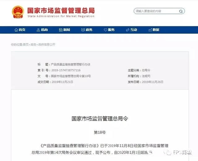 11月26日,國家市場監(jiān)督管理總局發(fā)布《產(chǎn)品質(zhì)量監(jiān)督抽查管理暫行辦法》,將自2020年1月1日起施行。《辦法》共56條,明確了監(jiān)督抽查的組織、抽樣、檢驗、異議處理、結(jié)果處理及相關(guān)人員應承擔的法律責任,對于加強產(chǎn)品質(zhì)量監(jiān)督管理、規(guī)范產(chǎn)品質(zhì)量監(jiān)督抽查工作、保護消費者的合法權(quán)益有重要意義。