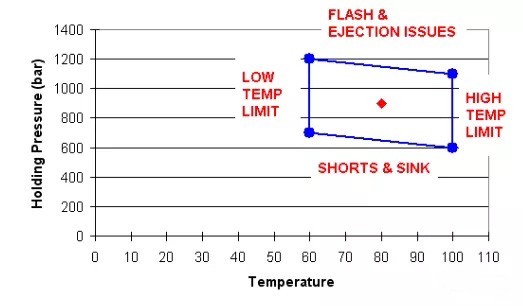 ????????外觀成型視窗同時會提供后續(xù)試模中因調整尺寸或者DOE試驗中允許使用的料溫/模溫及保壓的上下限。