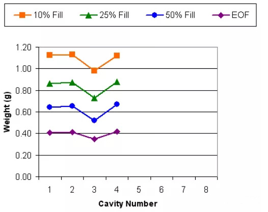 ????????只有多穴的情況下才會需要做這個測試,比如2穴或者多穴。目的是檢查在不同的充填階段,各穴之間的最大偏差百分比。