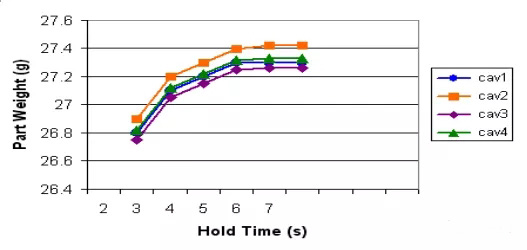 對冷流道模具或者半冷流道(熱轉冷),為保證模與模之間的可重復性,保壓壓力一定要持續(xù)到澆口完全冷卻。????????曲線生成以后, 選擇一個產(chǎn)品重量穩(wěn)定以后的時間。在上圖中,產(chǎn)品重量在7s后就不再增加,所以為安全起見同時彌補工藝本身的波動, 保壓時間要設定為8s。