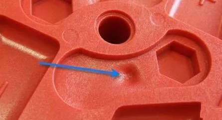 ????????所謂凹痕就是冷卻慢的部分在氣泡收縮的方向產生了顯眼的凹面;所謂氣孔指模具內的材料從表面開始固化,對模具內的全部容積來講材料相對不足,由于這個原因產生了真空狀態的孔,一般發生在制品厚的地方和注料口處。