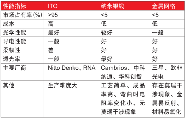 ????????納米銀線是一種直徑在納米范圍(一般在20-100納米之間)、長度沒有限制的金屬銀一維纖維。納米銀線具有體積小、比表面積大、良好化學性能和催性能、導電性能、抗菌性能和生理相容性,具體如表4所示。納米銀線的生產方法有:模板輔助、多元醇、光波輻射、軟化學溶劑熱等,多元醇法由于操作簡單、生產效率高、成本低廉成為當前主流生產方法,缺點是產品濃度低。例如納米銀線可以生產透明柔軟塑料導電膜,具體結構為基材為PET薄膜,涂覆層為納米銀線分散液,表層為丙烯酸保護涂層。基材為支撐層,中間涂層為透明導電層,保護層為保護銀不被氧化降低導電性能,主要替代ITO和金屬網透明導電薄膜。
