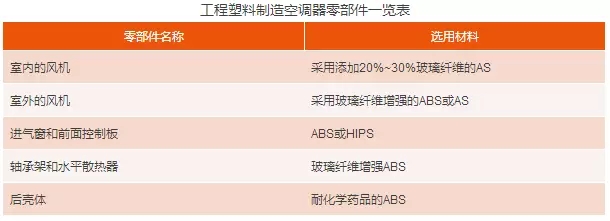 ????????空調一般分為室內機和室外機兩部分。室內機所用塑料占到總重量的30%以上,其中使用最廣泛的是ABS和HIPS??諝膺^濾器是由PP纖維在PP支架上圍織,排水管用軟質PVC擠出。室外機殼體已經逐漸采用塑料代替鋼板,其中進氣窗和控制板采用HIPS制備,貫流風機部件采用玻纖增強ABS,室外機殼體目前采用耐候PP制備。