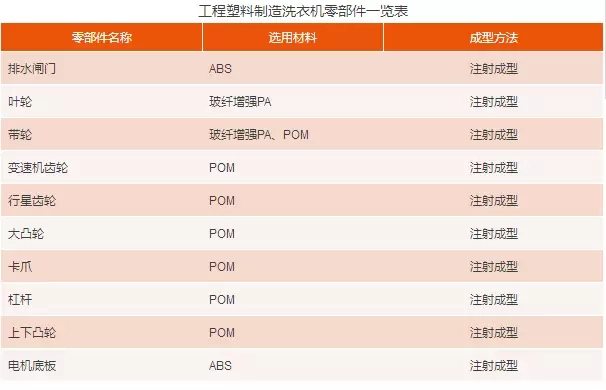 ????????洗衣機也是使用塑料件較多的家用電器之一,主要包括內筒、底座、波輪等,一臺雙缸洗衣機使用塑料約7-12千克,全自動洗衣機可達20千克,占洗衣機總重量的30%左右。其中,使用的最多的是通用塑料PP,工程塑料用的較多的是POM、PA和ABS。