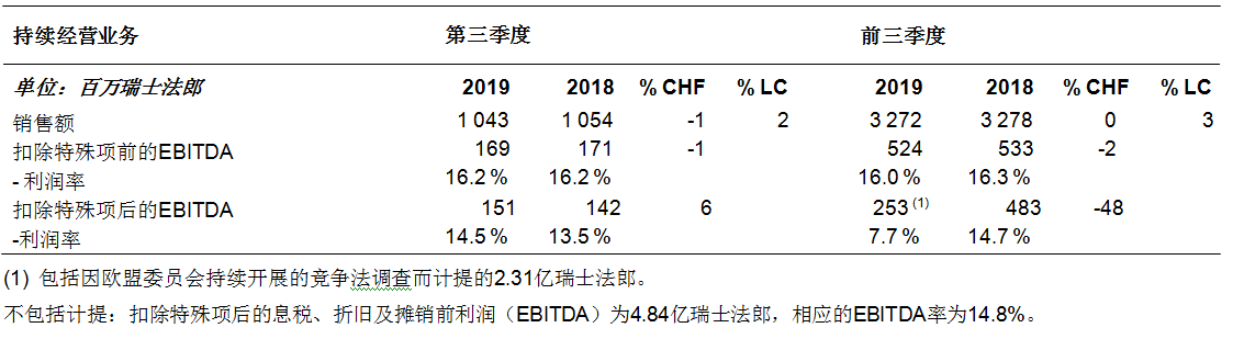 ????????· 持續(xù)經(jīng)營業(yè)務(wù)扣除特殊項(不包括歐盟委員會計提)后息稅、折舊及攤銷前利潤(EBITDA)穩(wěn)定在4.84億瑞士法郎
