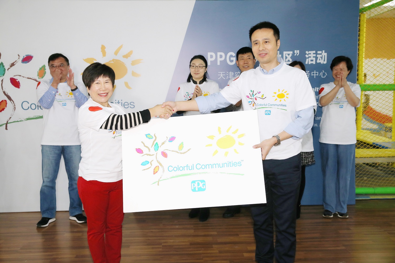 PPG公司亞太區企業及政府事務總經理延彩明(左)向天津港保稅區社區管理辦公室主任鄒啟東(右)贈“多彩社區”牌。