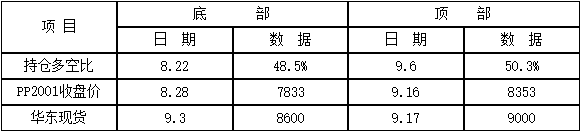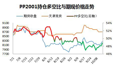????????第二、7月以來(lái)多空比曲線下行過(guò)程中,PP期現(xiàn)價(jià)格并不同步,多空比形成階段性底部和頂部相對(duì)領(lǐng)先,在50%臨界線之下,多單逐步增加,多空比逐步提升,此時(shí)配合基本面情況,有擇機(jī)介入短多的機(jī)會(huì)。多空比在8月22日達(dá)到階段性底部48.5%,之后開(kāi)始一波反彈,多空比的底部領(lǐng)先期現(xiàn)價(jià)格一周左右時(shí)間,8月28日PP2001收盤7833元/噸,華東現(xiàn)貨在9月3日8600元/噸,相繼形成底部;9月6日,持倉(cāng)多空比50.3%形成階段性頂部,且50%臨界線之上僅僅維持兩天就再次轉(zhuǎn)頭下行,此次多空比領(lǐng)先了期現(xiàn)價(jià)格10天左右。總之當(dāng)多空比、期貨和現(xiàn)貨價(jià)格同向而行,“共振”之際,方可順勢(shì)而為。