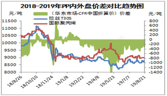 ????????面對(duì)國(guó)內(nèi)PP產(chǎn)能激增時(shí)代,無(wú)論是貿(mào)易還是生產(chǎn)企業(yè)都在謀求出路,于是出口成為多數(shù)業(yè)者最佳選擇。由PP出口套利對(duì)比分析中發(fā)現(xiàn),以CFR東南亞拉絲為例,國(guó)內(nèi)PP拉絲產(chǎn)品出口到東南亞價(jià)格仍高于當(dāng)?shù)貎r(jià)100-150元/噸,而且照目前兩者價(jià)差發(fā)展趨勢(shì)發(fā)現(xiàn),國(guó)內(nèi)市場(chǎng)在8月底至9月初正是下游需求逐步恢復(fù)之際,國(guó)內(nèi)價(jià)格有抬高可能,短期仍不適合開(kāi)啟出口窗口。
