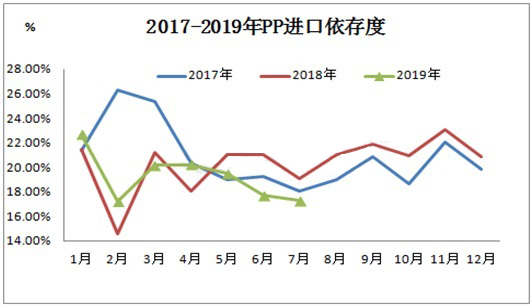 ????????由2017-2019年P(guān)P進(jìn)口依存度發(fā)現(xiàn),2019年4月份進(jìn)口依存度開(kāi)始逐步下挫,7月進(jìn)口依存度同比下降1.82%,環(huán)比下降0.42%。由此數(shù)據(jù)可發(fā)現(xiàn)進(jìn)口PP產(chǎn)品在國(guó)內(nèi)依存度呈現(xiàn)逐步下降趨勢(shì)。其實(shí)這與國(guó)內(nèi)PP產(chǎn)能激增密不可分,進(jìn)口PP產(chǎn)品由于整體價(jià)高,在國(guó)內(nèi)市場(chǎng)競(jìng)爭(zhēng)優(yōu)勢(shì)逐步減弱,除部分高端專(zhuān)用產(chǎn)品在下游仍占據(jù)優(yōu)勢(shì)外,按照目前國(guó)內(nèi)PP擴(kuò)能計(jì)劃逐步實(shí)現(xiàn),進(jìn)口PP在國(guó)內(nèi)依存度有進(jìn)一步下降趨勢(shì)。