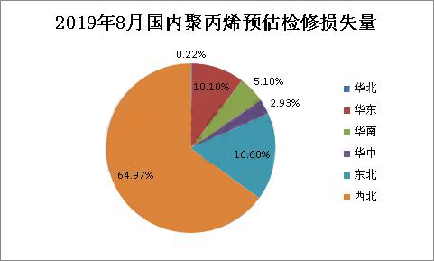 ????????由上圖可以看出,未來8月份國內聚丙烯檢修裝置主要集中在西北、東北和華東地區,西南地區暫無裝置檢修。西北地區檢修裝置主要有獨山子石化、延安能源化工、神華榆林和神華新疆等;東北地區大慶煉化雙線8月份按計劃檢修;華東地區常州富德常停裝置短期內未有重啟計劃。