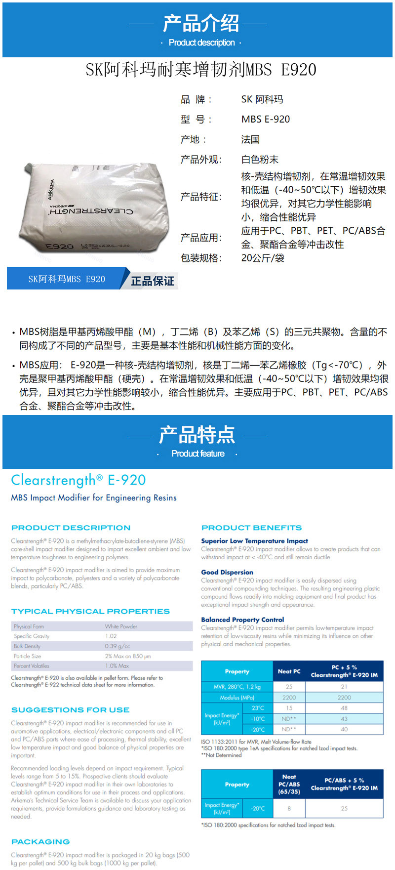 - 增韌劑MBS E920 抗沖擊改性劑 PC/ABS工程塑料增韌 SK阿科瑪E-920 物性表, 增韌劑MBS E920 抗沖擊改性劑 PC/ABS工程塑料增韌 SK阿科瑪E-920 產品參數,增韌劑MBS E920 抗沖擊改性劑 PC/ABS工程塑料增韌 SK阿科瑪E-920 性能表,增韌劑MBS E920 抗沖擊改性劑 PC/ABS工程塑料增韌 SK阿科瑪E-920 出廠報告, MSDS,, 物質安全資料表, UL黃卡,{ SGS報告, RoHS, 食品級認證, NSF飲用水標準, 產品資料, 產品性能, 出廠報告, 原廠原包, 代理商, 熱變形溫度, 熔指數, 流動系數, 抗沖擊性能、沖擊強度, 低溫韌性、低溫抗沖擊性能, 熔體流動系數、熔體流動速率, 加工工藝、加工參數、加工溫度, 歐盟RoHS 德國FDA 美國FDA 日本FDA
