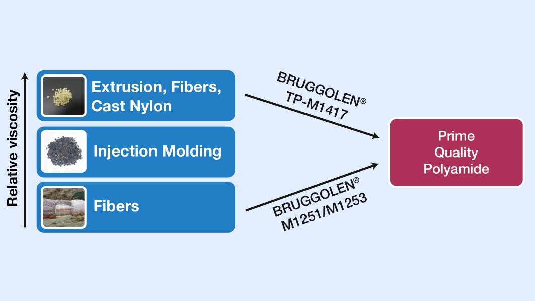 在聚酰胺回收應用中,BRUGGOLEN M系列反應性鏈改性劑可通過延長過短的鏈或縮短過長的鏈來精確且可重現地調節相對粘度。