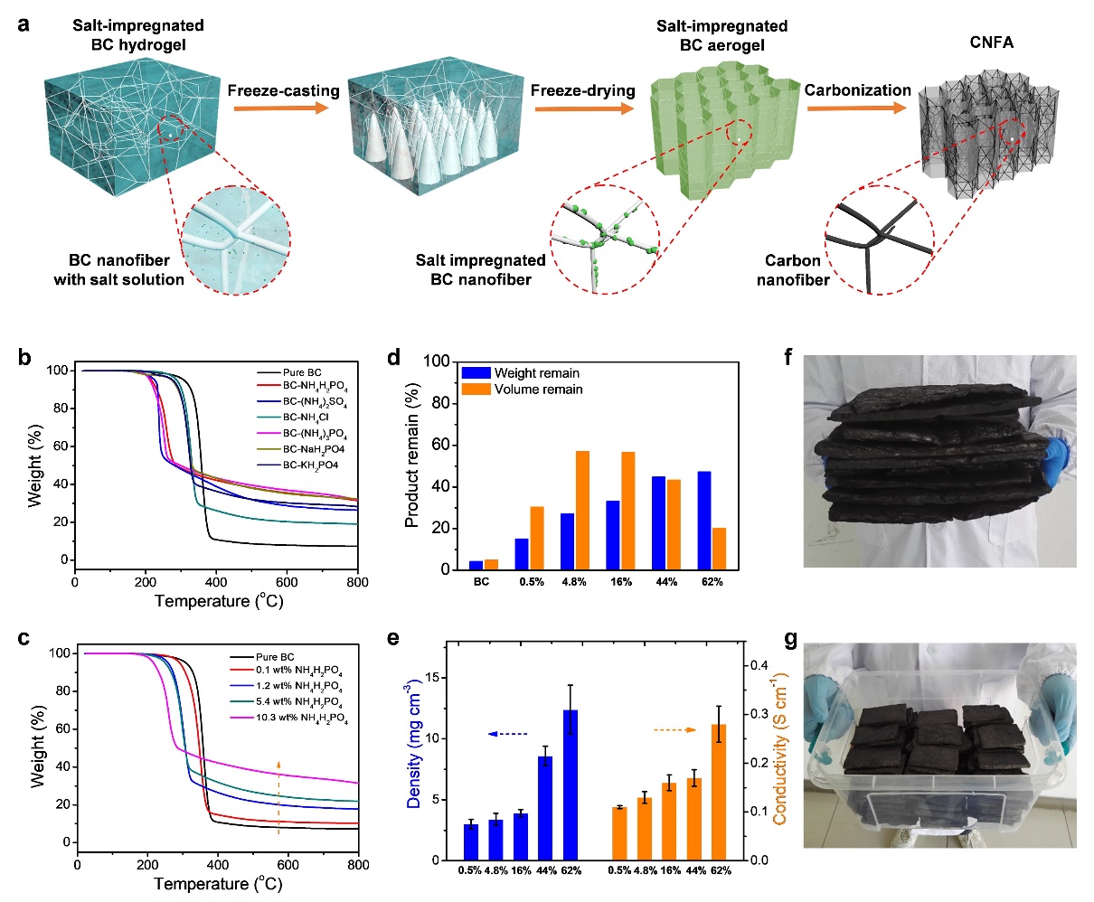 圖1、宏觀尺寸CNFAs的合成。(a)CNFAs制造工藝示意圖;(b)純BC和BC浸漬NH4H2PO4、(NH4)2SO4、NH4Cl、(NH4)3PO4、NaH2PO4或KH2PO4的TG曲線;(c)純BC和BC浸漬不同濃度NH4H2PO4后的TG曲線;(d)以純BC和BC為原料,在800°C下加入不同量的NH4H2PO4炭化制備CNFAs(NH4H2PO4的重量比分別為0.5、4.8、16、44和62 wt%);(e)1200 ℃下制備的CNFAs的密度和導電性;(f ~g)在800℃下制備的CNFAs照片,展示了其可以大規模制備。
