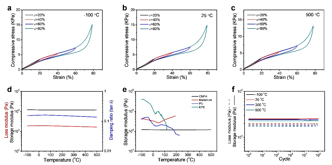 圖2、CNFAs在T = -100~500℃時N2中的熱力學穩定的力學性能。(a~c)形變為20%、40%、60%和80%時CNFAs的壓縮應力-應變曲線,溫度分別為:a)-100 °C、b)25 °C和c)500 °C;(d)CNFAs在T = -100-500℃時的粘彈性(儲存模量、損耗模量和阻尼比);(e)CNFA、三聚氰胺、PU和EPE泡沫的儲存模量隨溫度的變化;(f)不同溫度下CNFAs在1×105次循環中的儲存模量和損耗模量。